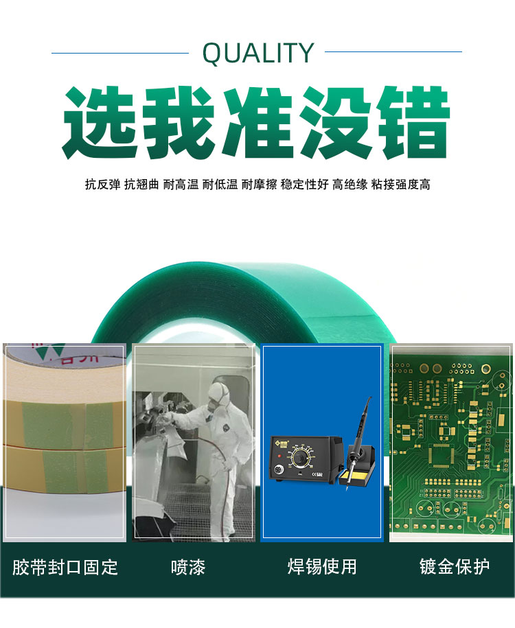 該膠帶膠紙以柔軟PET聚酯薄膜為基材,單面涂布高性能有機硅壓敏膠而成。主要用做高溫環境工作表面處理遮蔽保護,電鍍,電泳、超高溫烤漆、粉末噴涂及晶片元件端電極使用等